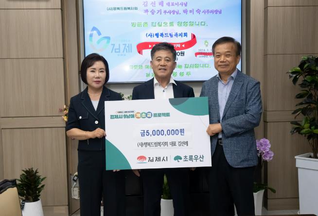 [뉴스서울] 김제시는 (사)행복드림복지회가 6일 광활면 다둥이 가구의 주거환경개선에 도움을 주고자 후원금 500만 원을 전달했다고 밝혔다.
