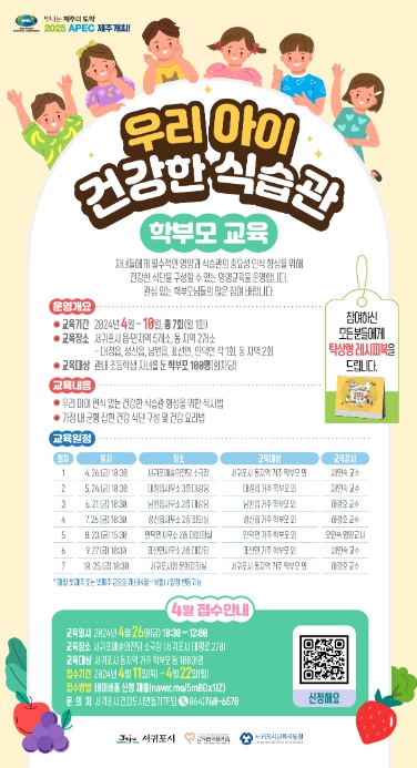 [뉴스서울] 서귀포시는 초등학생 자녀를 둔 학부모를 대상으로 ‘우리 아이 건강한 식습관 학부모 교육’을 4월부터 10월까지 월 1회 서귀포시 전 읍면과 동 지역을 순회하며 운영한다.