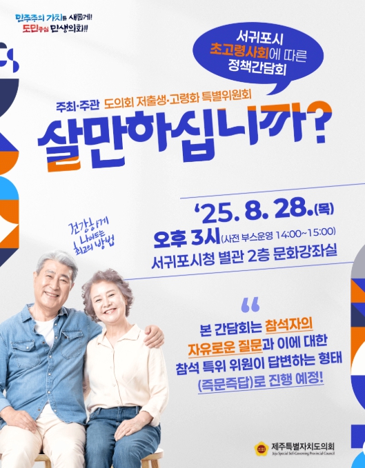 [뉴스서울] 제주도의회는 28일 오후 서귀포시청 별관 문화강좌실에서 ‘서귀포시 초고령사회에 따른 정책간담회-살만하십니까?’가 열린다고 밝혔다.