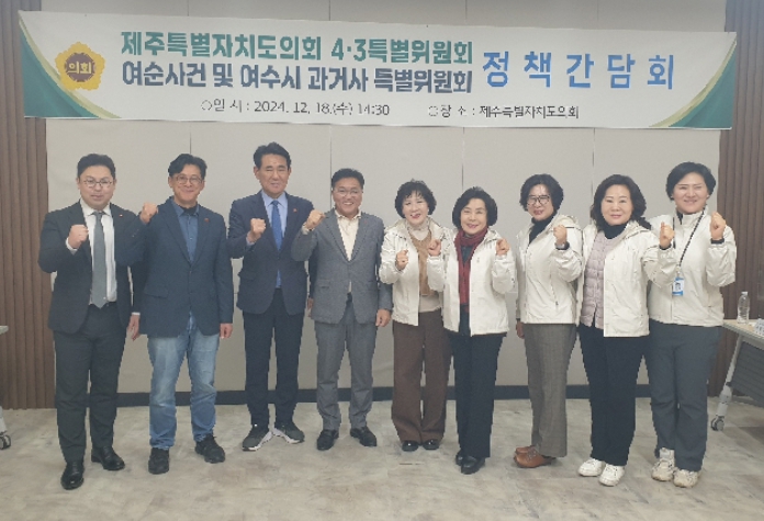 [뉴스서울] 제주특별자치도의회 4·3특별위원회는 18일 제주특별자치도의회 소통마당에서 여수시의회 여순사건 및 여수시 과거사특별위원회와 정책간담회를 개최했다.