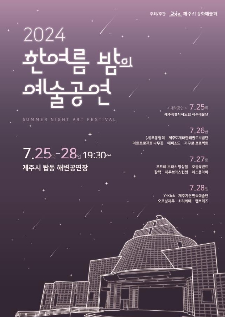 [뉴스서울] 제주시는 7월 25일부터 7월 28일까지 4일간 탑동 해변공연장에서 '2024 한여름밤의 예술공연'을 개최한다.