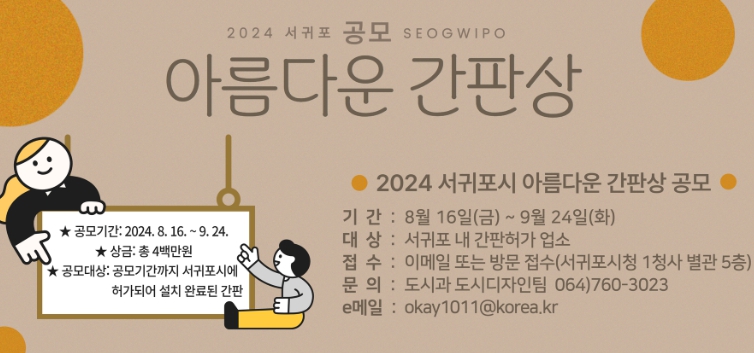 서귀포시 아름다운 간판상’공모전은 예술적이고 아름다운 간판 발굴 및 홍보를 통해 아름다운 간판 문화 확산을 유도하는 시민참여 공모사업으로 2012년부터 시행되고 있으며 지금까지 아름다운 간판 55점을 선정하여 진행해 왔다.
