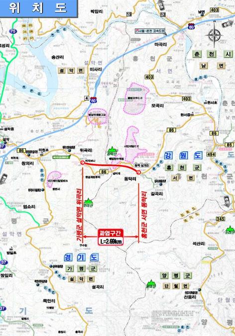 이 사업은 강원특별자치도 홍천군 서면 동막리에서 경기도 가평군 설악면 위곡리을 연결하는 총연장 L=2.69km(터널 1.7km 포함), 총사업비 648억원이 소요되는 사업으로 제4차 국도⋅국지도 5개년 계획에 반영되어 추진하던 중 총사업비가 500억이상으로 증액되어 지난해 1월부터 기획재정부 한국개발연구원에서 타당성 재조사 용역을 진행하면서 사업추진에 어려움을 겪고 있었다.