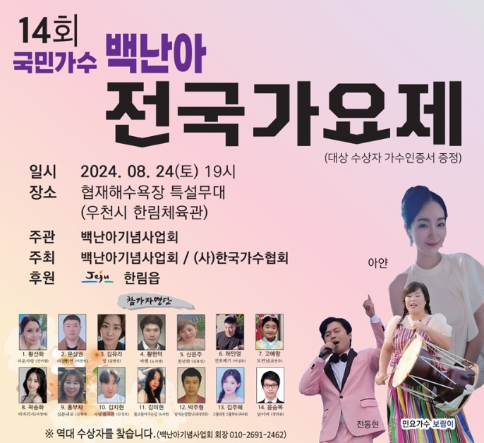 국민가수 백난아기념사업회가 주최·주관하는 이번 가요제는 8월 3일에 실시한 예선에서 58팀의 참가자 중 14팀이 치열한 경쟁을 뚫고 올라와 본선에서 열띤 경연을 펼칠 예정이다.