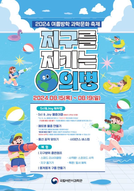 특히, 환경을 지키기 위해 재활용품(페트병)을 활용한 ‘나만의 물총 만들기’체험과 물총 대결을 펼쳐보는 ‘Sci & Joy 물폭탄(워터밤)’, 지구 환경 보호와 물의 순환과 상태에 대한 과학적 지식과 원리를 배워보는 다양한 프로그램이 우리 어린이 친구들을 기다리고 있다.