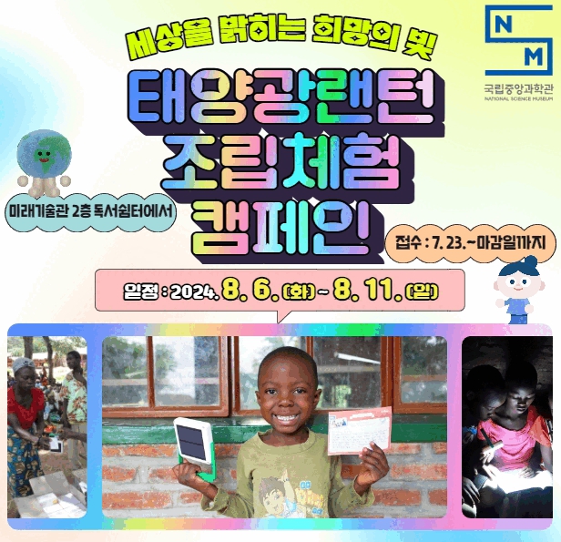 [뉴스서울] 과학기술정보통신부 국립중앙과학관은 밀알복지재단과 협력하여 2024년 8월 6일부터 11일까지 “세상을 밝히는 희망의 빛 태양광손전등 조립체험 운동(캠페인)”을 개최한다.
