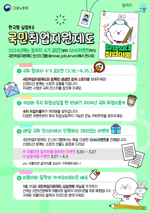 공모전, 취업이룸카, 온라인 참여형 이벤트 등에 대한 자세한 정보는 고용노동부 국민취업지원제도 인스타그램에서 확인할 수 있다.
