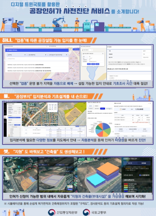 국토부 이상주 국토도시실장은 “공장인허가 사전진단 서비스는 국토부가 보유한 디지털트윈 노하우와 토지, 건축 등 인허가 검토 시 필수적인 정보를 활용하여 타 부처와 함께 민원행정업무 혁신을 도모한 첫 사례”임을 강조하면서, “본 서비스가 민원 현장에 안정적으로 정착할 수 있도록 적극 지원하고, 앞으로 타 인허가 분야로도 확대 적용하여 대국민 민원 편의성을 제고하는 데 국토부가 앞장서겠다”고 밝혔다.