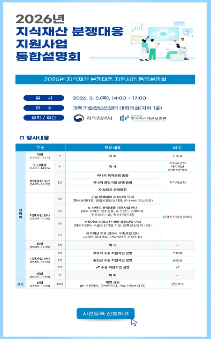 이를 위해, 지식재산처는 3월 5일 과학기술컨벤션센터(서울 강남구)에서 2026년 지식재산 분쟁대응 지원사업 통합설명회를 개최한다고 밝혔다. 본 설명회에서는 지식재산처의 지식재산 분쟁대응 지원사업과 대한무역투자진흥공사, 중소벤처기업진흥공단, 한국농수산식품유통공사의 수출 지원사업을 함께 소개하고, 지식재산 전문가를 통한 현장상담도 진행한다.