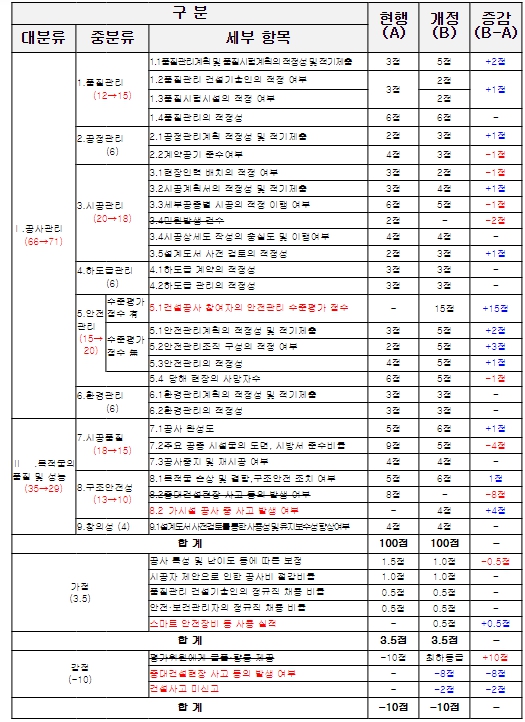 모든 현장에 민원이 발생(2건 이상)하고 있어 변별력이 없는 민원발생 항목(2점)은 삭제하고 예정공기를 준수할 경우에도 우수 등급을 받도록 하는 등 평가의 객관성 확보를 위해 세부 평가 기준을 개정했다.