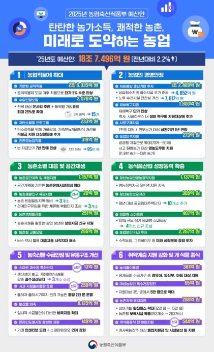 농식품부는 농업인 소득·경영안전망 강화, 농촌소멸 대응 및 공간 재생, 농식품산업 성장동력 확충, 농축산물 수급안정 및 식량안보 강화 등 주요 농정과제 성과 창출을 위한 분야에 2025년 예산을 중점 투자할 계획이다.