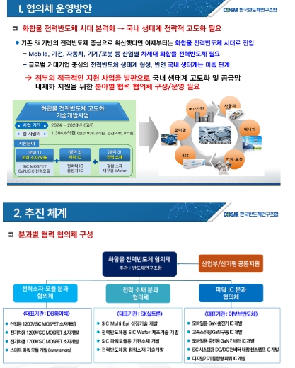 동 행사에서는 산기평 - 조합 - 전력반도체 앵커 기업들 간 국내 화합물 전력반도체 생태계를 구축을 위한 업무협력 양해각서(MOU) 체결식이 열렸다. 양해각서(MOU)에 따르면 산기평은 사업 참여 기관들에 대한 연구개발(R&D) 전주기를 밀착 지원하고, 조합은 화합물 전력반도체 분야별 협의체를 주관한다. 화합물 전력반도체 웨이퍼를 생산하는 ‘SK실트론(소재분야)’과 전력반도체 분야 대표 팹리스인 ‘어보브반도체(IC분야)’, 8인치 레거시 공정 파운드리 기업인 ‘DB하이텍(소자·모듈분야)’은 웨이퍼 제작부터 설계-제조에 이르는 과정까지 국내에 선순환적 생태계가 마련될 수 있도록 적극 협력한다. 이어 화합물 전력반도체 고도화 사업의 모든 수행기관들은 1차년도 사업 추진계획을 발표 했으며, 과제별로 개발되는 기술들 간 상호 연계 방안 등에 대한 토의가 이루어졌다.