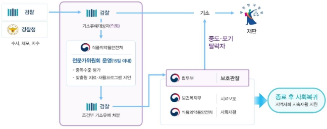 [뉴스서울] 정부는 마약류 투약 사범의 원활한 사회복귀를 지원하고, 재범을 방지하기 위해 기소유예자 대상으로 필요한 치료·재활을 제공하는 ‘사법-치료-재활 연계모델’을 오늘부터 전국 확대 실시한다고 밝혔다.
