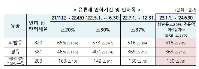 개정안은 중동위기 고조 등에 따라 국내외 유류 가격 불확실성이 여전히 지속되고 있는 점 등을 고려한 것이다. 이번 개정을 통해 인하 전 세율 대비 휘발유 △205원/리터(ℓ), 경유 △212원/리터(ℓ), 액화석유가스(LPG)부탄 △73원/리터(ℓ)의 가격 인하 효과가 향후 2개월간 유지되어 국민들의 유류비 부담 경감에 기여할 것으로 기대된다.