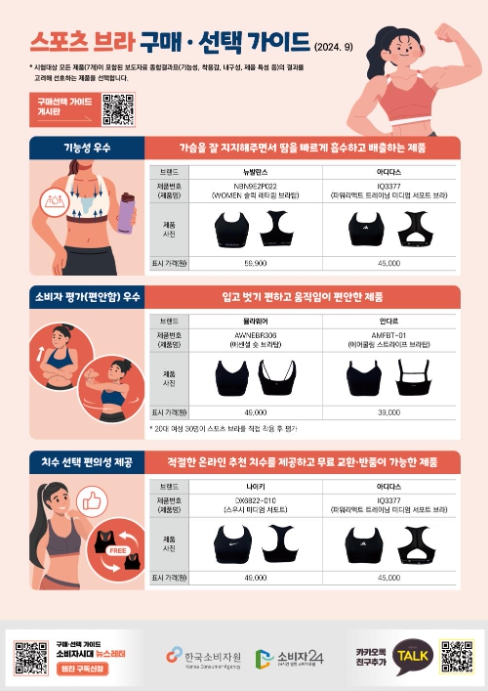 이에 공정거래위원회 한국소비자원이 소비자 선호도가 높은 7개 브랜드의 스포츠 브라 7종을 선정하여 지지력, 흡수성 등 기능성과 착용감, 제품 특징 등을 시험·평가했다.