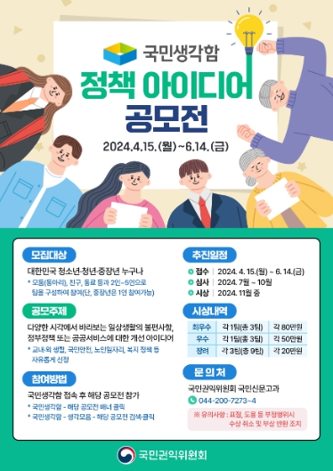 [뉴스서울] 국민권익위원회는 2024년 ‘국민생각함 정책 아이디어 공모전’을 개최하여 국민들의 생활 속 불편해소와 공공 서비스 개선 방안을 모색한다.