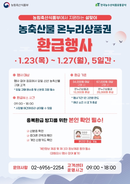 [뉴스서울] 농림축산식품부는 설 명절 소비자 물가부담 완화를 위해 1월 23일부터 1월 27일까지 전국 188개 전통시장에서 '설맞이 전통시장 온누리상품권 환급행사'를 개최한다.