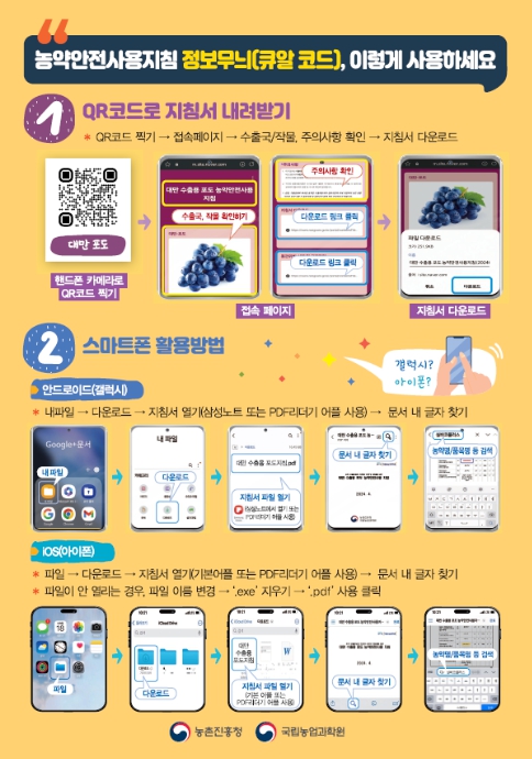 [뉴스서울] 농촌진흥청은 농업인이 수출농산물 생산과정에서 정확한 농약안전사용 정보를 편리하게 확인할 수 있도록 정보무늬(큐알 코드)로 농약안전사용 지침을 제공하기 시작했다고 밝혔다.