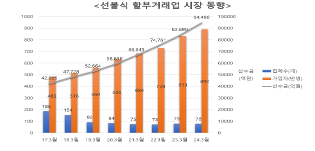 선불식 할부거래 관련 가입자 수와 선수금 규모는 매년 지속적으로 증가하고 있다. 가입자 수는 작년 하반기 대비 약 59만 명이 증가한 892만 명이며 그 중 적립식 여행상품의 가입자 수는 28.5만 명(3.2%)이다. 또한, 선수금 규모는 1조 596억 원이 증가한 9조 4,486억 원이며 그 중 적립식 여행상품의 선수금 규모는 419억 원(0.4%)이다.
