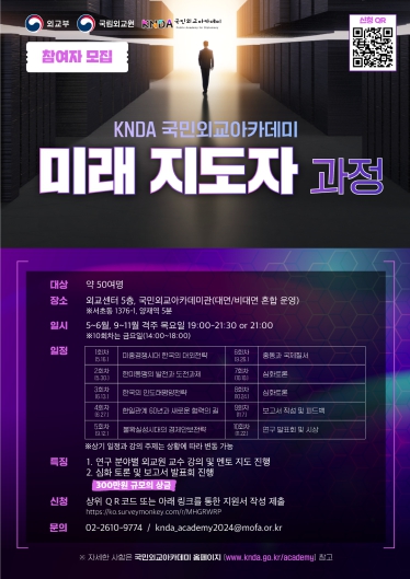 국립외교원 국민외교아카데미가 2024년 새롭게 선보이는 '미래 지도자 과정'은 외교·안보 분야 신진 전문가 육성에 기여하고, 연구자 간 협업·네트워킹 기회를 제공할 것으로 기대된다.