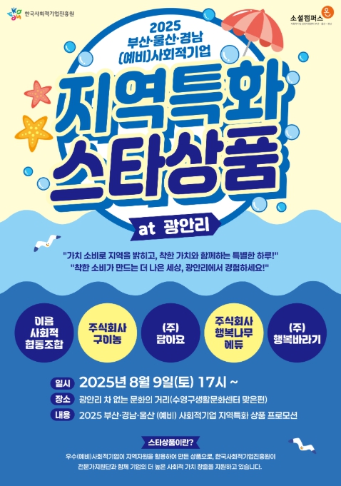 [뉴스서울] 고용노동부는 본격적인 여름 휴가철 국내외 관광객이 모이는 부산의 대표적인 관광지 광안리 해변 일대에서 부산·울산·경남 대표적인 사회적기업의 우수상품을 선보이는 자리가 마련된다고 밝혔다.