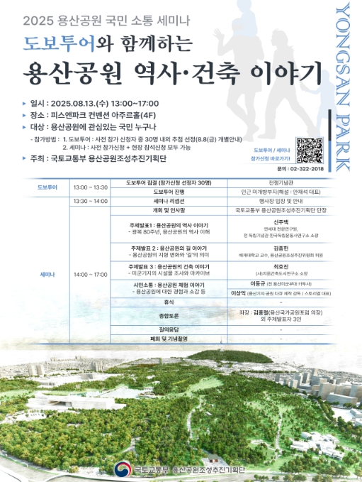 [뉴스서울] 국토교통부는 8월 13일 오후 전쟁기념관(서울 용산) 부지 내에 있는 피스앤파크 컨벤션에서 '도보 투어와 함께하는 용산공원 역사·건축 이야기 세미나'를 개최한다.