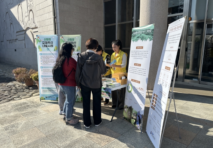 현장에서는 산림청의 2025년 상반기 대표 규제혁신 사례와 하반기 추진중인 규제합리화 사례를 설명한 규제혁신 홍보물을 배포하며 알기 쉽게 설명했다.