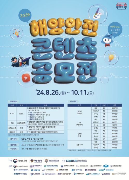 [뉴스서울] 해양수산부와 해양경찰청은 “해양안전문화 확산을 위해 '2024 해양안전 콘텐츠 공모전'을 8월 26일부터 10월 11일까지 개최한다.”라고 밝혔다.