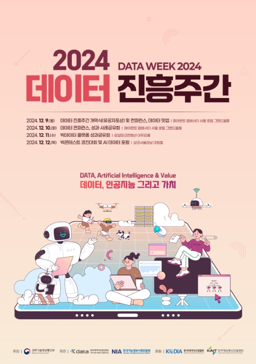 과학기술정보통신부는 데이터 경제 활성화와 인공지능 혁신 생태계 조성을 위해 12월 9일부터 12일까지 데이터진흥주간 행사를 서울 여의도(12.9-10, 페어몬트 앰베서더 서울)와 이태원(12.11, 로얄파크컨벤션), 강남(12.12, 보코서울강남)에서 개최한다고 밝혔다.