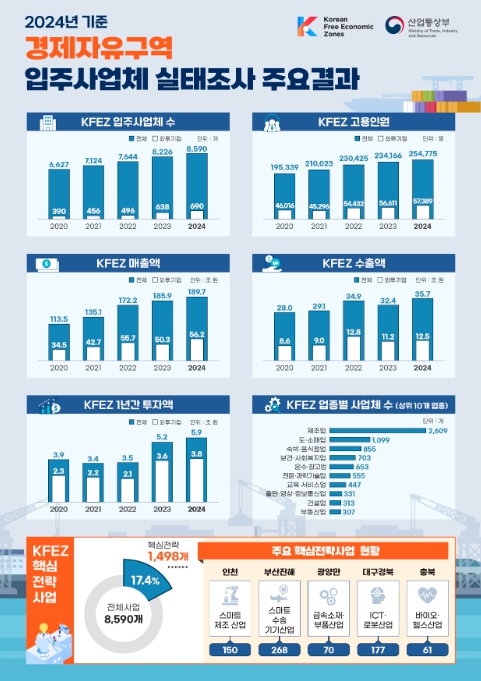 이번 조사 결과, 경제자유구역 내 외국인투자기업 수는 전년 대비 8.2% 증가했으며, 고용은 8.8%, 투자액은 14.4% 증가하는 등 주요 지표 전반에서 긍정적인 흐름이 확인됐다.
