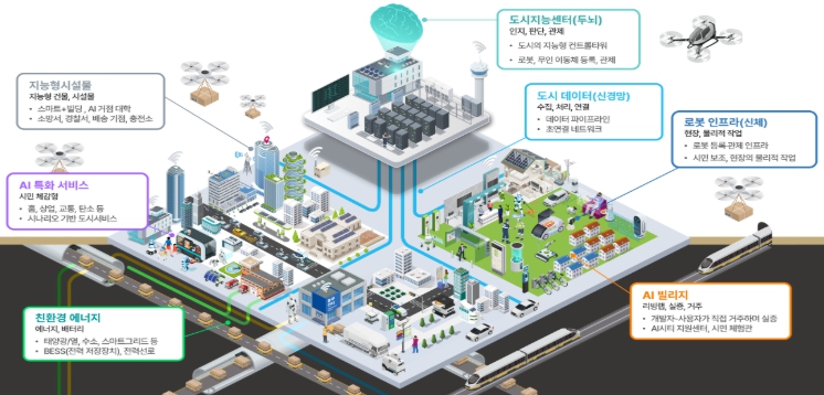 이에 정부는 국가 마중물 사업으로, AI 학습용 도시데이터 활용 등 규제특례를 허용하고, AI 인프라를 통한 분야별 AI 연계·학습으로 도시 내 이상징후 감지 및 실시간 대응을 통해 도시문제를 해결, 더 나아가 로봇·자율주행차 등 피지컬 AI도 문제없이 수용·관제하는 AI 특화 시범도시를 조성하기로 했다.