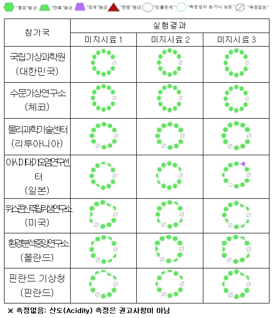 국립기상과학원은 이번 실험에서 산성도, 전기전도도, 황산이온 등 분석 요소 11종 모든 성분에 대해 강수화학 세계데이터센터의 기준값에 가장 근접하게 분석하여 최고 성적을 거뒀다. 이번 실험에서 체코 수문기상연구소와 함께 최우수 성적을 거둔 것은 최근 5년간 연속 3위안에 드는 기술력을 바탕으로 우리나라 강수화학 분석기술의 우수성을 증명한 쾌거이다.