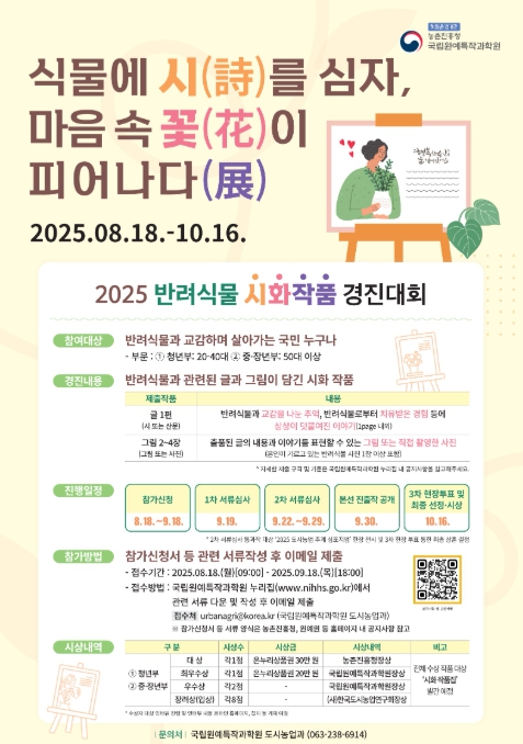 [뉴스서울] 농촌진흥청 국립원예특작과학원이 ‘식물에 시(詩)를 심자, 마음속 꽃(花)이 피어나다’란 주제로 여는 반려식물 시화 작품 경진대회 출품작을 8월 18일부터 9월 18일까지 접수한다고 밝혔다.