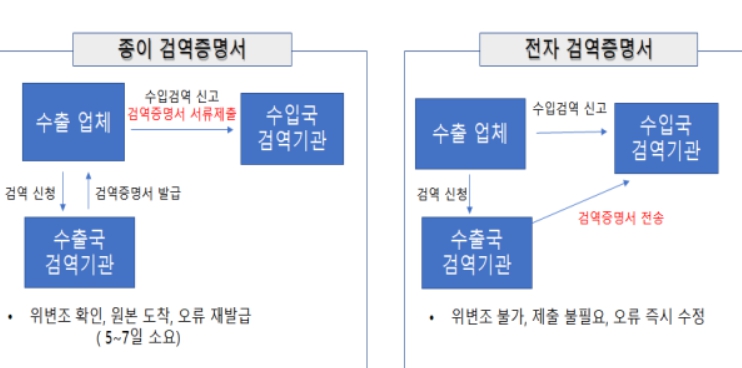 그리고 종이 검역증명서 발급 시 증명서 형식이나 내용에 문제가 있을 경우 5~7일 정도 소요되던 확인·보완 기간을 단축할 수 있어 시간‧비용의 절감으로 교역국 간 무역 활성화에도 기여할 것으로 예상된다.