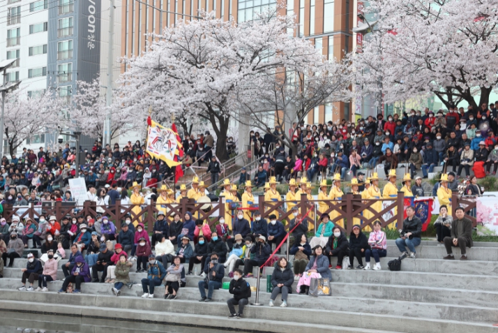 [뉴스서울] 5일 불광천에서 활짝 핀 벚꽃과 함께 ‘은평의 봄’ 벚꽃축제가 열렸다. 오후 6시 30분부터 처용무, 천고무 미디어아트, 국악인 남상일 공연 등 전통문화예술 공연이 펼쳐졌다.
