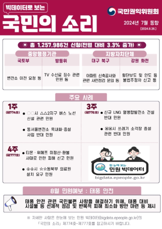 이와 함께 국민권익위는 지난 한 달 동안 민원분석시스템에 수집된 7월 민원빅데이터 동향을 발표했다.