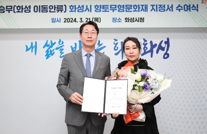 [뉴스서울] 화성시가 ‘승무(화성 이동안류)’를 화성시 향토무형문화재 제1호로 지정하고 21일 향토무형문화재 보유자로 선발된 김정아 씨에게 향토문화재 지정서를 교부했다.