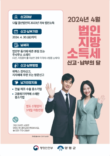 [뉴스서울] 양평군은 4월 법인지방소득세 신고·납부의 달을 맞아 오는 30일까지 법인지방 소득세 신고납부기간을 운영한다고 밝혔다.