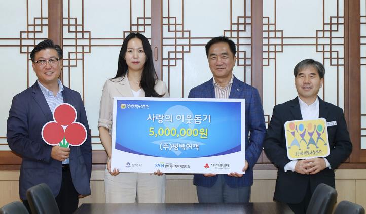 평택여객(주)은 2007년 3월 설립하여 죽백동에 있으며 2023년 추석맞이 500만 원 기부를 시작으로 꾸준한 기부와 나눔에 앞장서고 있다. 이번에도 추석을 맞이하여 어려운 취약계층을 위해 500만 원을 기부했다.