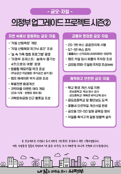 [뉴스서울] 의정부시는 시민들의 삶의 환경을 한 단계 개선하기 위한 ‘의정부 업그레이드 프로젝트’의 시즌2 금오‧자일편을 27일 발표했다.