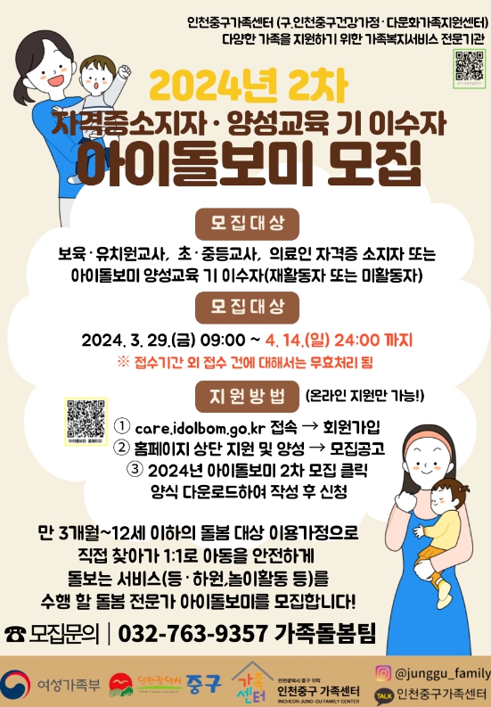 [뉴스서울] 인천시 중구(구청장 김정헌)는 중구가족센터(센터장 정광웅)에서 관내 자녀 양육 가정에 돌봄 서비스를 제공하기 위해 ‘2024년도 2차 아이돌보미 공개 모집’을 추진한다고 8일 밝혔다.
