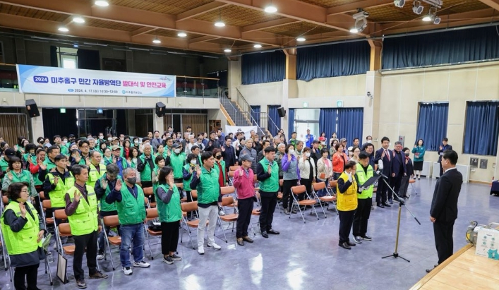 [뉴스서울] 미추홀구보건소는 17일 구청 대회의실에서 동, 전통시장 등 29개 반 230여 명의 단원이 참석한 가운데 민간 자율방역단 발대식 및 안전교육을 진행했다.
