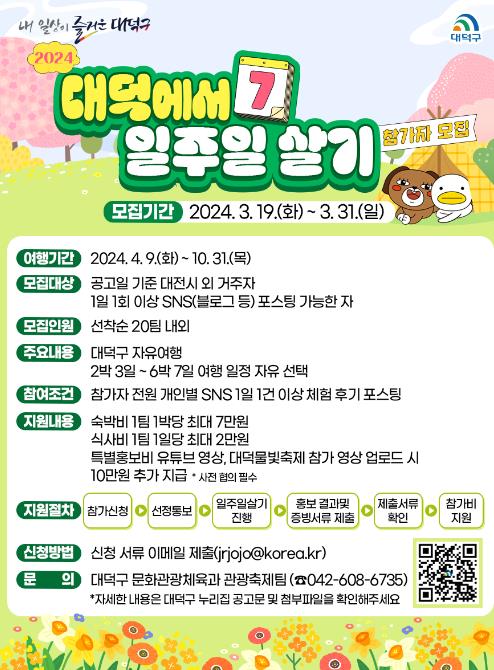 [뉴스서울] 대전 대덕구는 오는 31일까지 ‘2024 대덕에서 일주일 살기’ 참가자를 모집한다고 밝혔다.