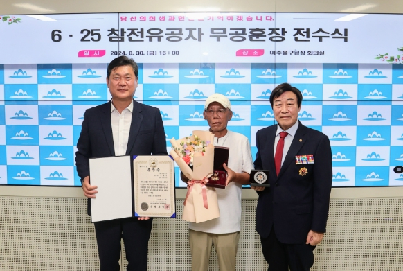 [뉴스서울] 인천 미추홀구는 지난 8월 30일 구청장실에서 6·25 전쟁에 참전해 무공을 세운 고(故) 김재선 하사의 유가족에게 국방부 장관을 대신해 화랑무공훈장을 전수했다.