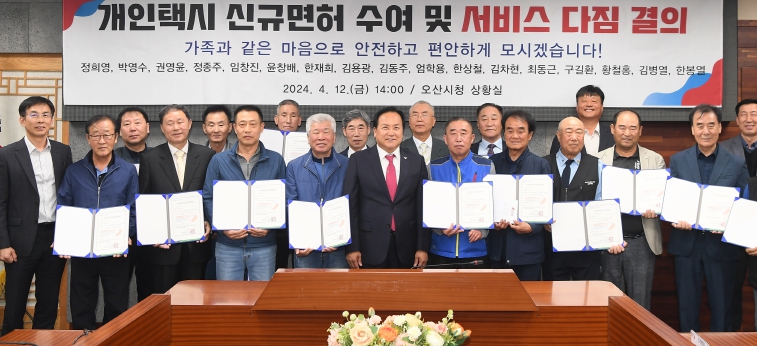 이날 수여식은 신규면허자들의 택시 서비스 다짐 결의와 신규면허자의 가족이 축하메시지 낭독 순으로 진행됐다. 이권재 오산시장이 신규면허자 17명에게 면혀를 직접 수여하고, 기념 촬영에도 나서며 의미를 더했다.