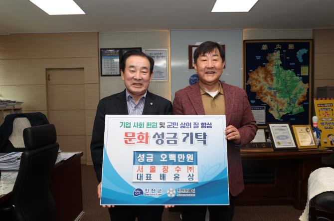 [뉴스서울] 광혜원면에 있는 서울장수㈜(대표 배윤상)는 27일 진천군청을 방문해 기업의 사회 환원 사업의 하나로 군민들의 문화생활을 지원하는 문화 성금 500만 원을 전달했다.