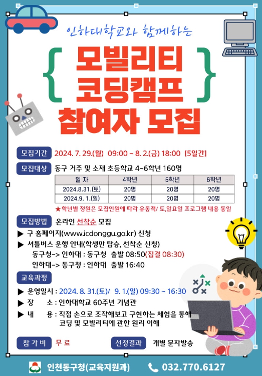 [뉴스서울] 인천 동구는 8월 31일 부터 9월 1일 인하대학교와 함께하는 ‘모빌리티 창의융합 코딩캠프’를 개최한다고 밝혔다.