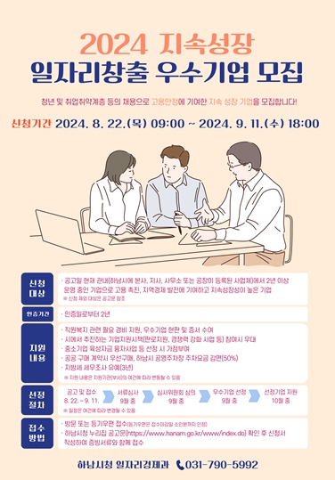 [뉴스서울] 하남시는 지역경제 발전과 고용 촉진에 노력하는 지속성장 일자리창출 우수기업에 직원복지와 관련된 필요경비 등 다양한 혜택을 부여하기 위해 오는 9월 11일까지 ‘2024년 지속성장 일자리창출 우수기업’을 모집한다고 밝혔다.