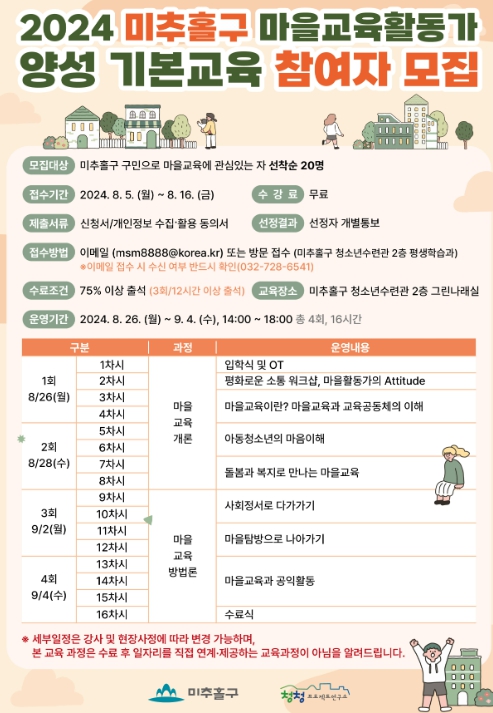 마을교육에 관심 있는 미추홀구 주민이면 누구나 무료로 수강할 수 있으며, 선착순 20명 모집한다.