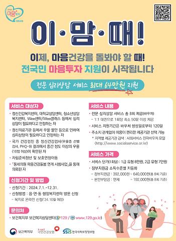 지원 대상은 정신건강복지센터, 정신의료기관 등에서 심리상담이 필요하다고 인정받은 자와 국가 건강검진에서 중간 정도 이상의 우울(10점 이상)함이 확인된 자, 자립준비청년 및 보호연장아동 등이다.